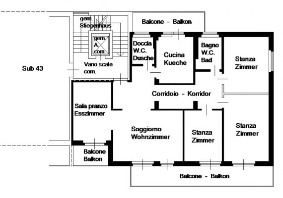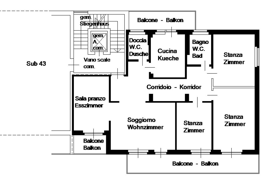 1 Diele, 1 Wohnzimmer, 1 Esszimmer, 1 Küche, 3 Schlafzimmer, 1 Bad / WC, 1 Dusche/WC, 1 Korridor, 3 Balkone, 1 Keller