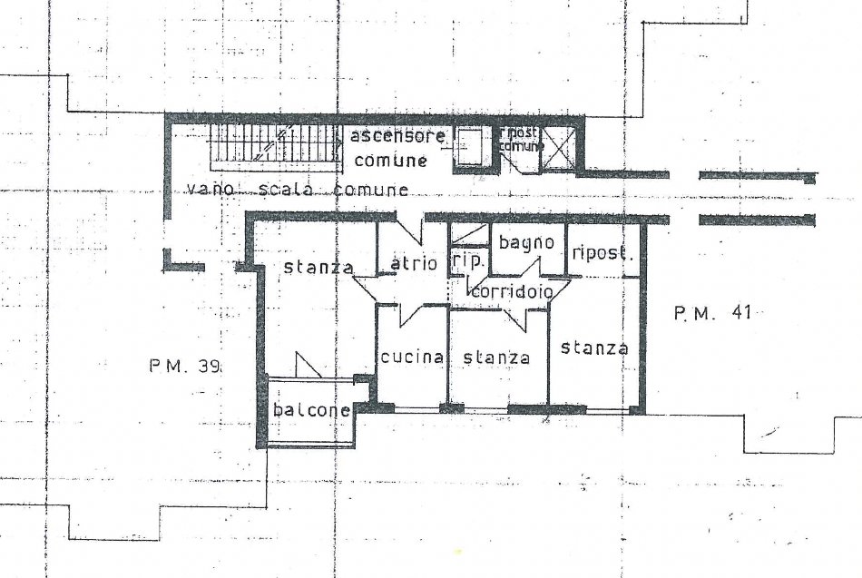 1 atrio, 4 stanze, 1, soggiorno, 1 sala, 1 cucina, 1 bagno-WC, 1 ripostiglio, 1 corridoio, 1 bagno, 2 balconi